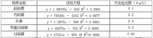 结果表明6种有机磷线性关系良好,检测限为0.08~0.4μg/L,能满足国标GB 3838-2002中对六种有机磷的限量要求。