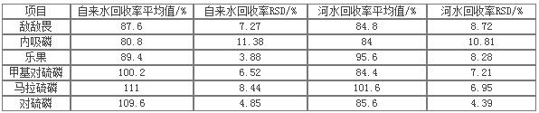 在自来水和河水中加入0.5ug 6种有机磷混标,分别作三次平行样,按处理样品的方法进行样品前处理,GC-MS 6800测试,采用外标法定量,计算其回收率,数据见下表: