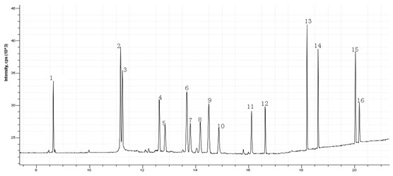 图1. 16种有机磷标准溶液TIC图